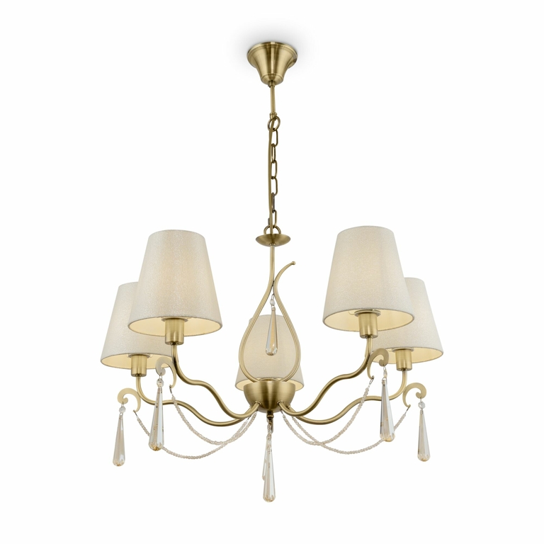 Металлическая арматура. Цвет – латунь. Абажуры из фактурной ткани белого цвета. Декор – хрустальные подвесы каплевидной формы. Одиночный подвес и торшер с цоколем Е27, лампа, бра и люстры – Е14.