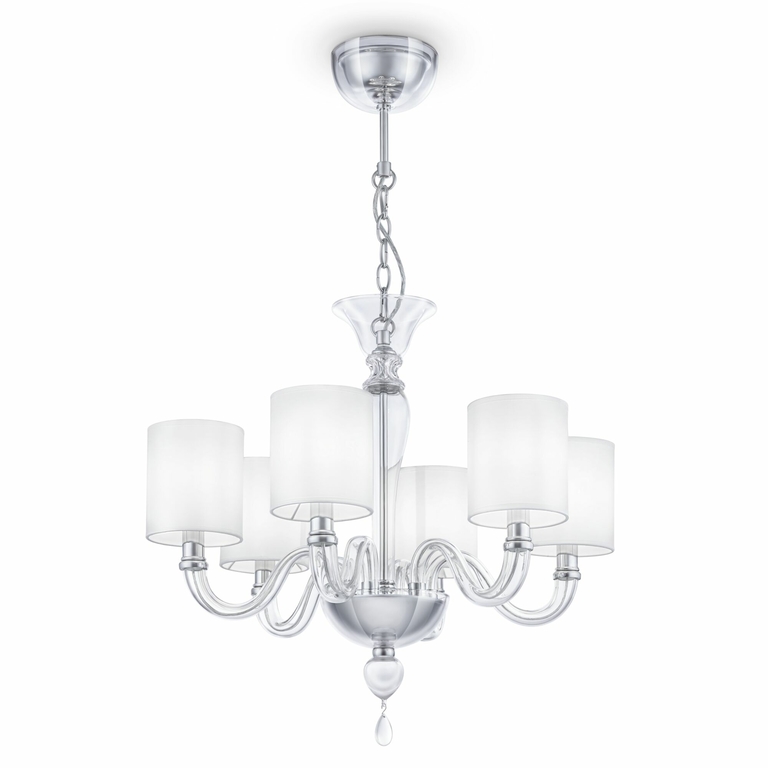 Серия Leti актуальна для интерьеров в неоклассическом стиле. Большая часть конструкции светильников состоит из деталей, изготовленных из прозрачного выдувного стекла. Абажуры из белого текстиля, нанесенного на ПВХ. Высоту люстр возможно отрегулировать длиной цепи.