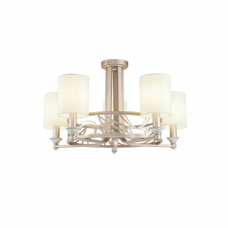 Просечной орнамент в стиле "модерн" расположился на декоративных панелях и обручах светильников. Каркас изготовлен из металла. Его нежный кремовый цвет с золотистым оттенком придает конструкции визуальную легкость. Абажуры из ткани белого цвета, нанесенной на ПВХ.