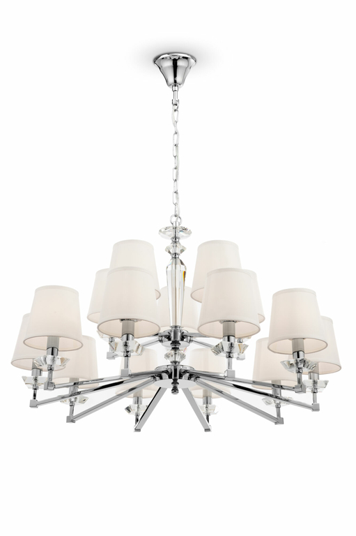 Металлическая арматура с гальваническим покрытием цвета никель. Абажуры из льна, нанесенного на ПВХ. Цвет абажуров – белый. Декор центральной части и рожков – прозрачное стекло. Высота люстр регулируется.