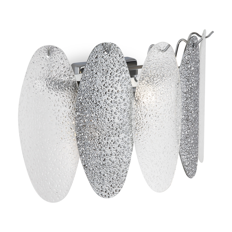 Материал арматуры – металл. Оттенки – золото, хром. Трендовый декор в виде фактурных вытянутых пластин из стекла. Часть пластин окрашена в тон арматуре, часть – прозрачная. Источник света – лампа с цоколем Е14.
