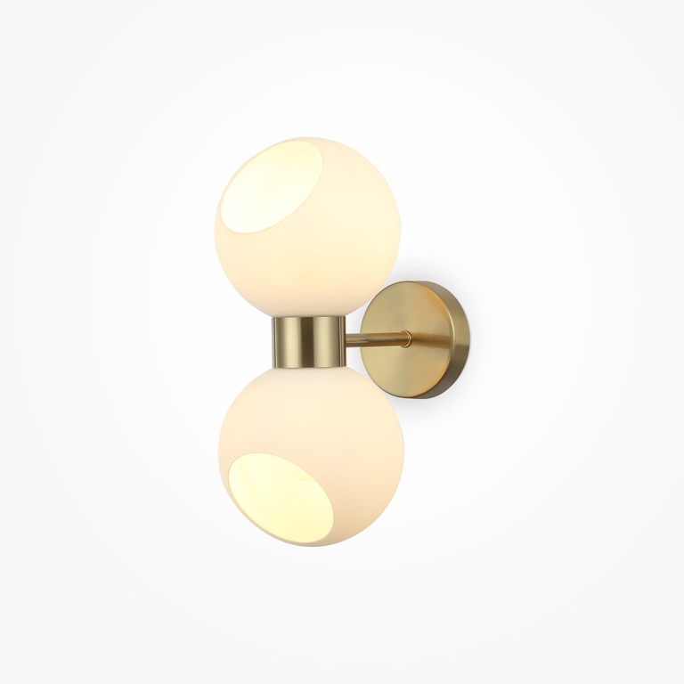 Металлическая арматура в цвете латунь. Открытые сферические плафоны в 2-х цветах: тёплый белый и тёмный гальванизированный. Плафоны разделены металлической вставкой в цвет арматуры. Источником света является лампа с цоколем G9. Для бра - цоколь Е27.