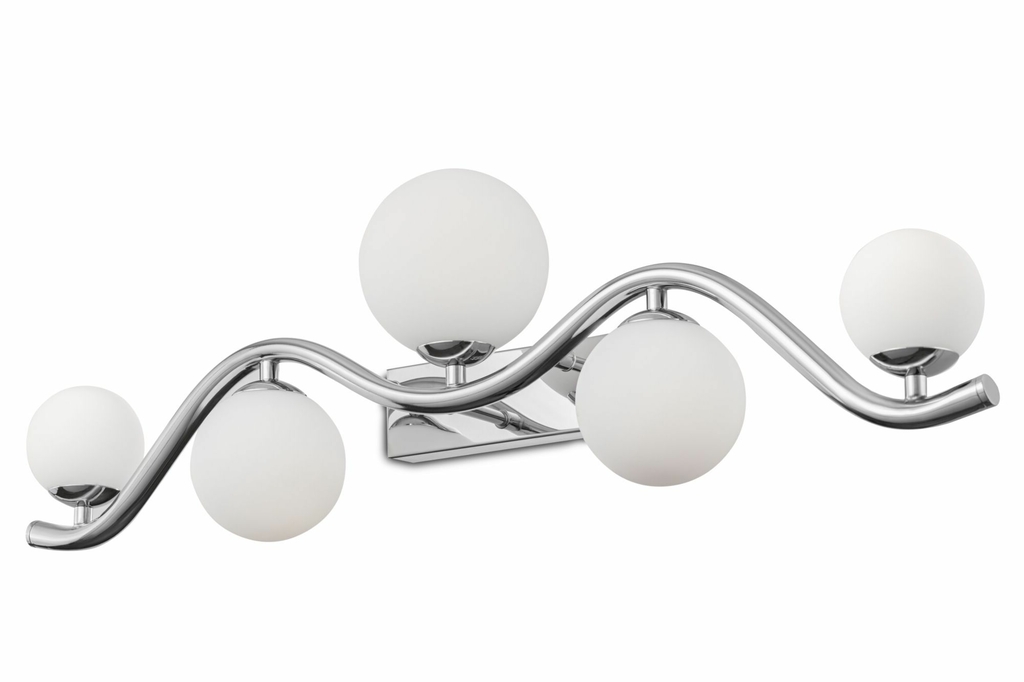 Металлическая арматура представлена в двух оттенках: хром и золото. Белые плафоны-сферы из матового стекла. Каркас оригинальной волнистой формы. Высота подвесных моделей регулируется тросом.