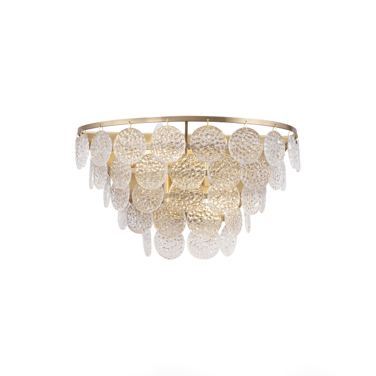 Материал арматуры – металл, цвет – золото. Фактурный декор из прозрачного стекла. Округлые подвески с рельефным узором скрывают источники света – лампы с цоколем Е14.