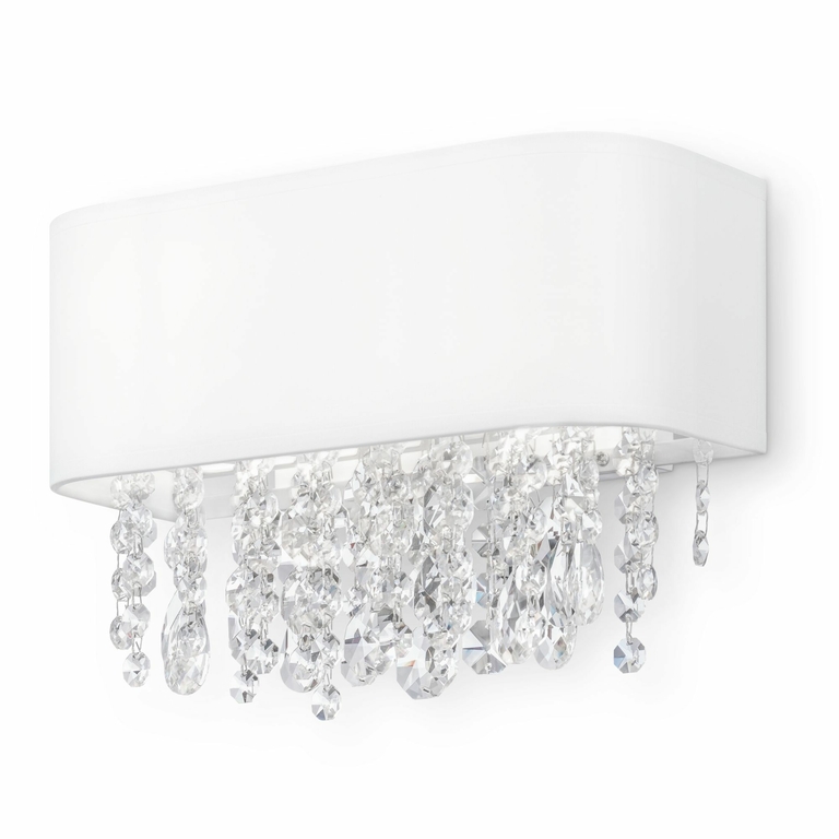 Металлическая арматура в белом цвете. Абажур – ткань, нанесенная на ПВХ, цвет – белый. Декор – подвески в виде граненых кристаллов. Высота подвесных светильников регулируется тросом.
