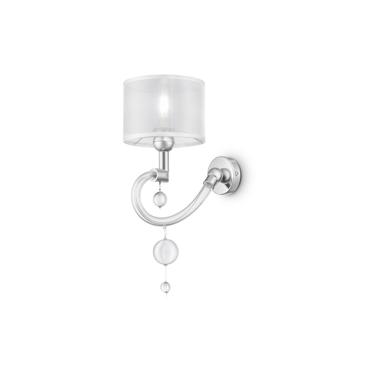 Хромированная металлическая арматура. Абажуры из белой органзы на ПВХ. Декор – прозрачное выдувное стекло. Крепление 2 в 1 – монтаж с цепью и без нее.
