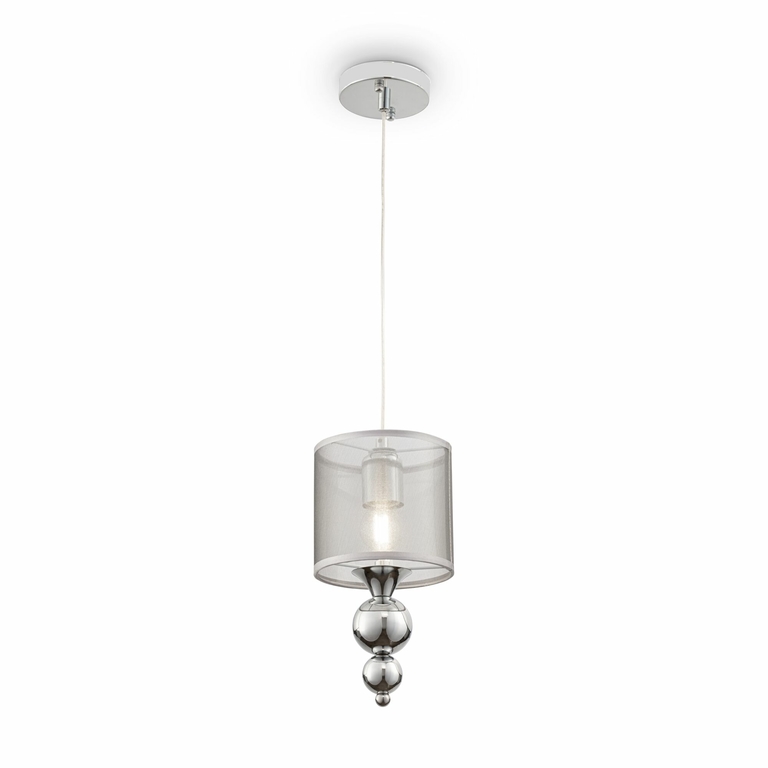 Материал арматуры – металл. Цвет – хром. Абажуры из полупрозрачной органзы серебристого оттенка. Декор – хромированные шары. Высота люстр регулируется. Одиночный подвес с цоколем Е27, лампа, бра, торшер и люстры – Е14.