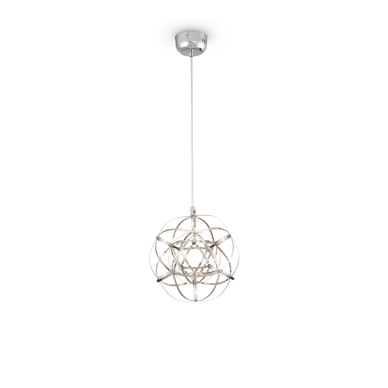 Серия Amber представляет воздушные светильники-сферы, выполненные в трендовом стиле хай-тек. Хромированная металлическая арматура и плафон, сотканный из переплетающихся лент, создают запоминающийся современный образ. Встроенные светодиоды экономят электроэнергию и красиво подсвечивают сферу. В выключенном состоянии светильник выглядит как абстрактное произведение искусства и является полноправной частью декоративного ансамбля интерьера. Серию составляют подвесы различного диаметра – их можно использовать по отдельности, а можно комбинировать в группы. Для обстановки в стиле хай-тек, минимализм, лофт, помещений кафе и ресторанов светильник станет идеальным решением.