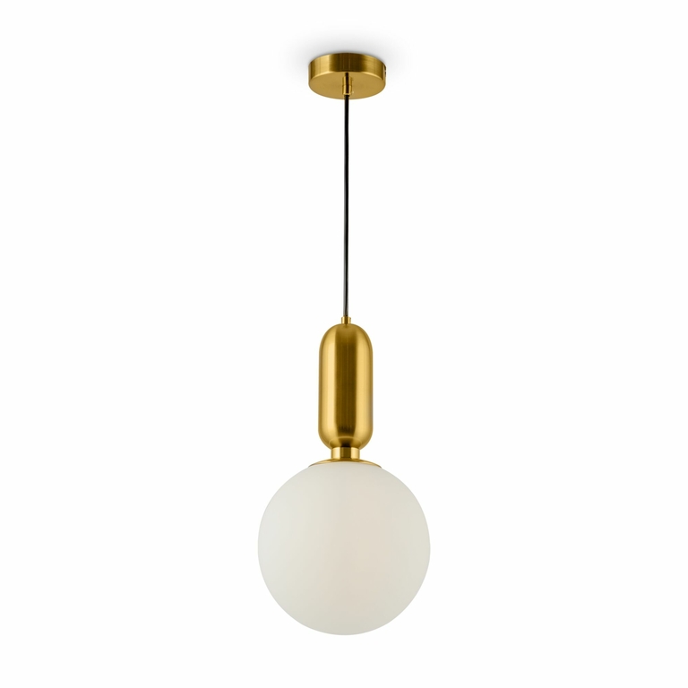 Материал арматуры – металл. Цвет – латунь. Плафоны-сферы из матового белого стекла. Минималистичный дизайн. В качестве источника света используется лампа с цоколем Е14.