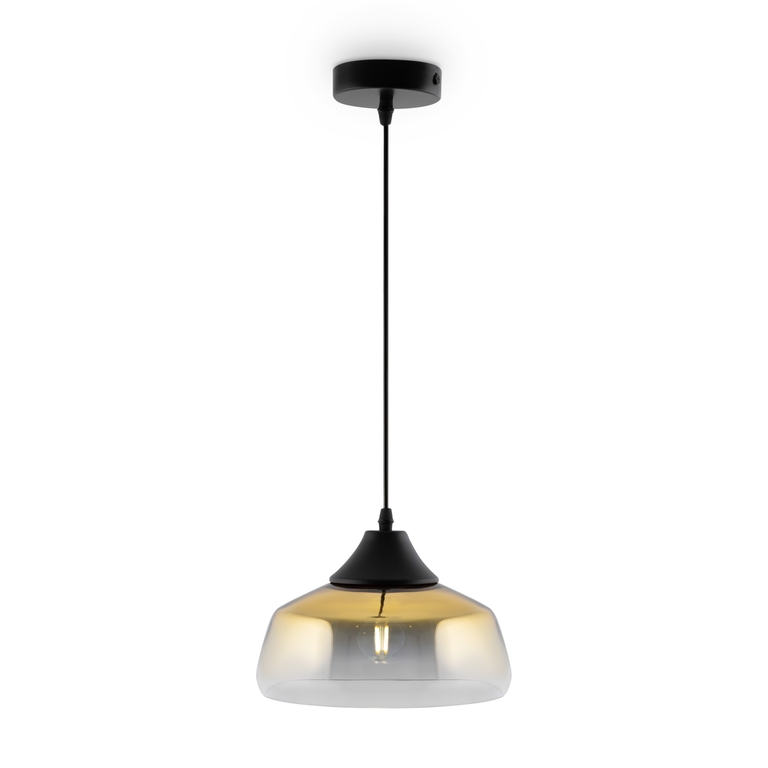 Металлическая арматура в черном цвете. Стеклянный плафон с мягким градиентным переходом оттенков. Цветовые решения – серый, янтарный. Трендовая обтекаемая форма. Источник света – лампа с цоколем E27.