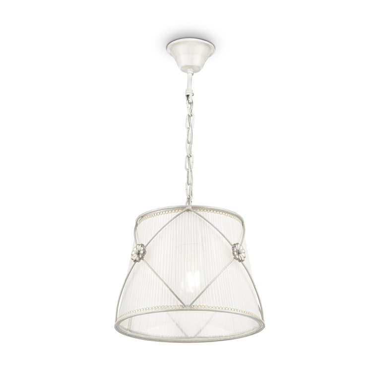 Арматура из металла в жемчужно-белом цвете. Кремовый абажур из плиссиро ванной органзы, окантовка золотистой тесьмой. Абажур заключен в металличе ский каркас. Флористический декор.