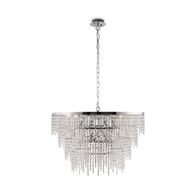Материал арматуры – металл, цвет – хром. Многоярусный стеклянный декор. Эффектная игра света. Визуально легкий дизайн. Высокие параметры освещенности. Регулируемая высота