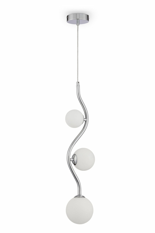 Металлическая арматура представлена в двух оттенках: хром и золото. Белые плафоны-сферы из матового стекла. Каркас оригинальной волнистой формы. Высота подвесных моделей регулируется тросом.