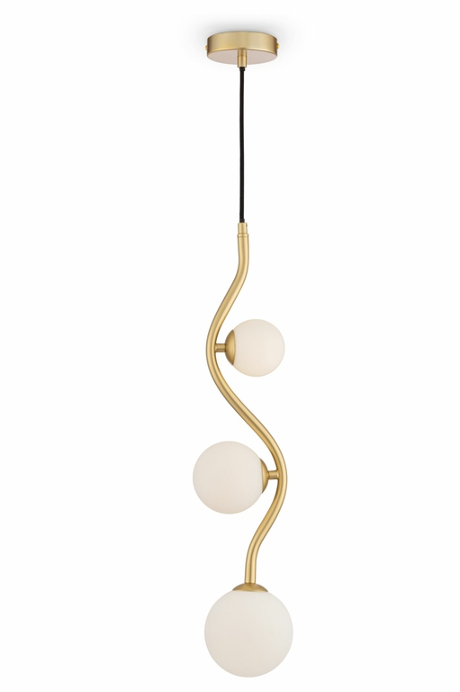 Металлическая арматура представлена в двух оттенках: хром и золото. Белые плафоны-сферы из матового стекла. Каркас оригинальной волнистой формы. Высота подвесных моделей регулируется тросом.