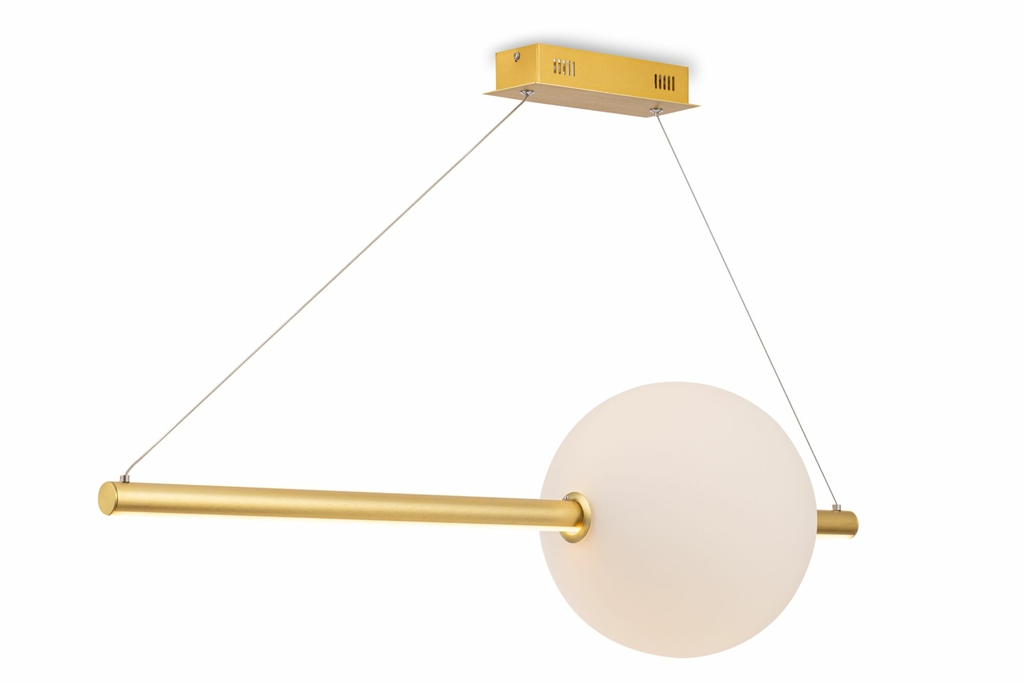 Арматура из металла в золотом цвете. Стеклянные плафоны-сферы бежевого оттенка. Источник света — SMD-светодиоды, интегрированные в каркас светильника. Цветовая температура 3000К. Регулируемая высота.