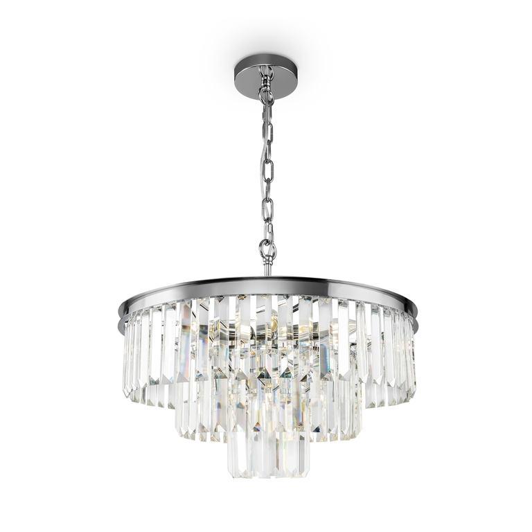 Арматура из металла в трех оттенках: латунь, хром, золото. Многоярусный декор. Подвески: прозрачное (арматура – хром, латунь) и янтарное (арматура – золото) стекло. Высота подвесных моделей регулируется.