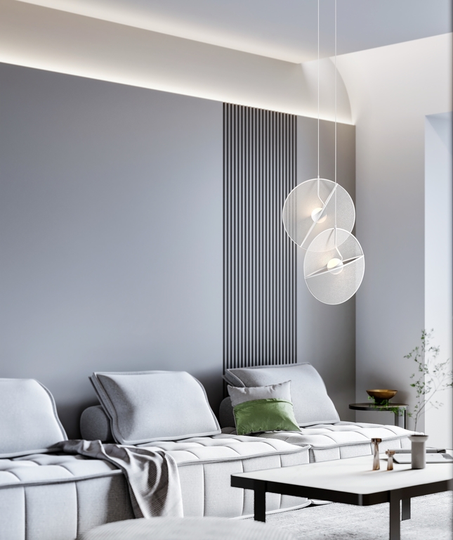 Арматура и плафон из металла и акрила. Цвет — белый. Декоративный светоотражающий элемент из полупрозрачной текстурированной ткани. Регулируемая высота. LED-источники света с цветовой температурой 3000К.