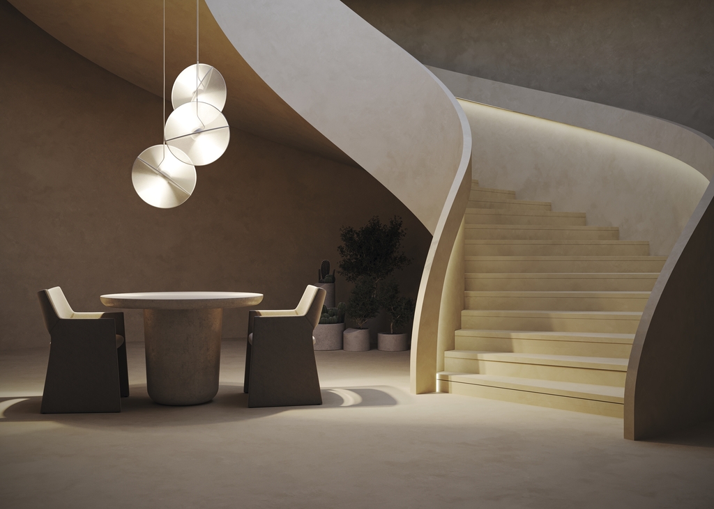 Арматура и плафон из металла и акрила. Цвет — белый. Декоративный светоотражающий элемент из полупрозрачной текстурированной ткани. Регулируемая высота. LED-источники света с цветовой температурой 3000К.