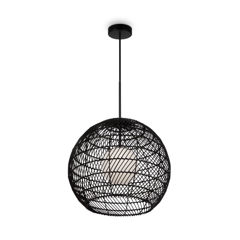 Материал арматуры - металл, цвет - черный. Внешний сферический абажур из проволочного плетения в бежевом и черном цветах. Внутренний плафон- белый матовый шар из стекла. Необычный микс неоклассики и экотренда - ручная работа + натуральные материалы. Регулируемая длина провода - 3 метра. Источник света - лампа с цоколем G9.