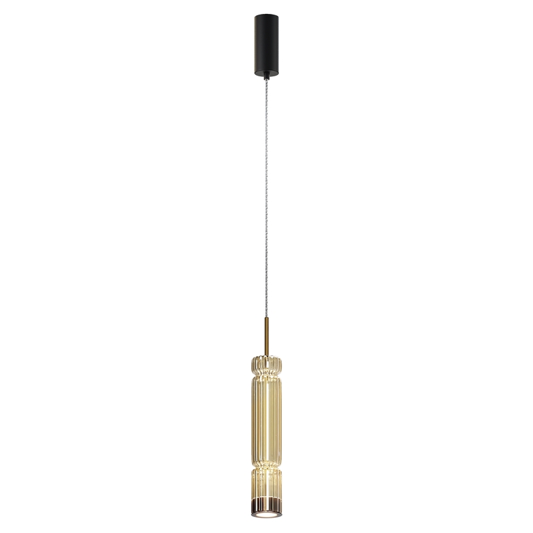 Арматура - металл, цвет - хром, латунь, черный. Цилиндрические плафоны из стекла с вертикальным рельефным рисунком в трех оттенках: прозрачный, коньячный, дымчатый. Метафора древнегреческих храмовых колонн в образе светильников. LED-источник света. Цветовая температура 3000К.