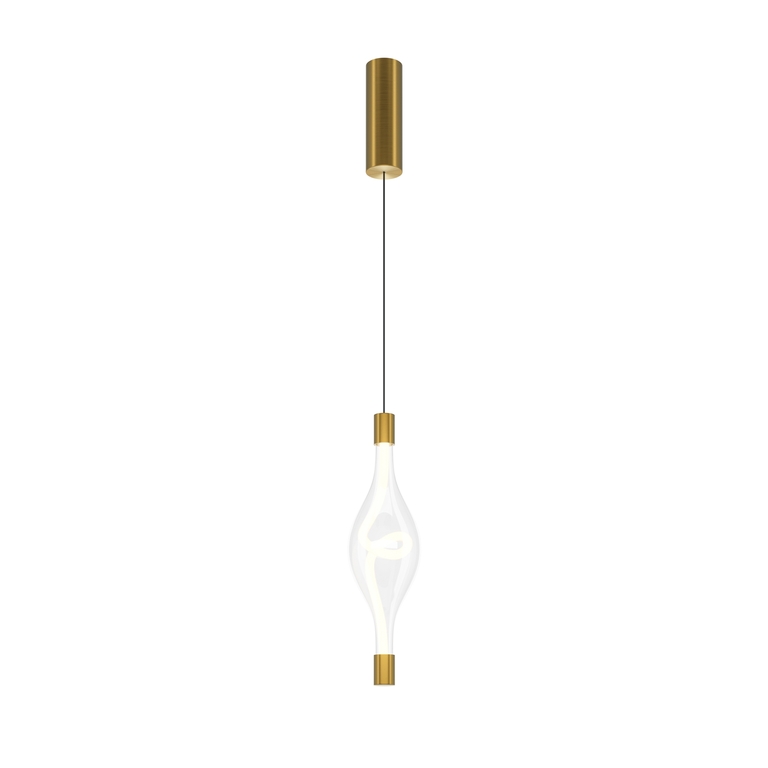 Арматура из металла в цвете латуни, плафоны — прозрачное стекло. LED-источник света в виде светодиодного тканевого шнура, цветовая температура 3000К и угол рассеивания 360°. Трендовая форма петли светодиодного шнура. Тросы подвесов регулируются по высоте до трех метров. Могут использоваться как основной источник света.