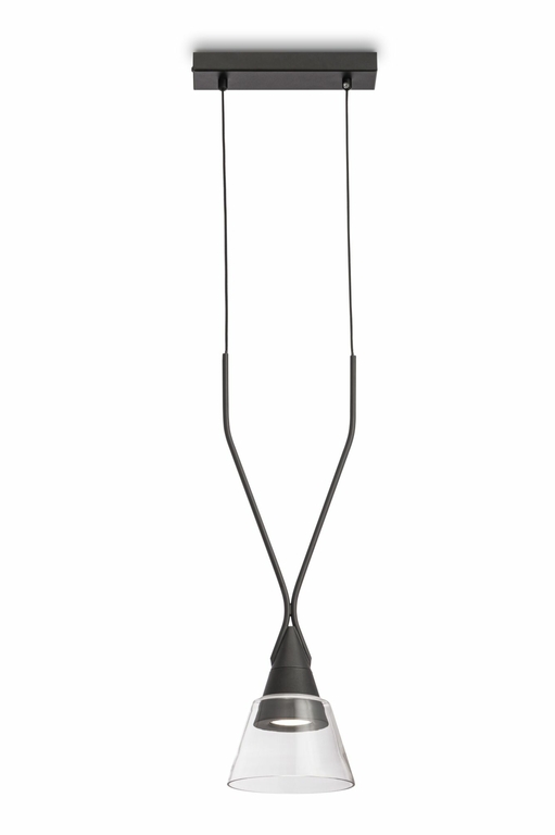 Сбалансированный и утонченный дизайн светильников основан на контрасте легкого прозрачного плафона из стекла и металлического корпуса, выкрашенного в черный цвет. Являясь полной противоположностью, детали светильника будто вытекают одна из другой. Лампа утоплена вглубь корпуса, что обеспечивает зрительный комфорт. Высота светильников регулируется длиной шнура.