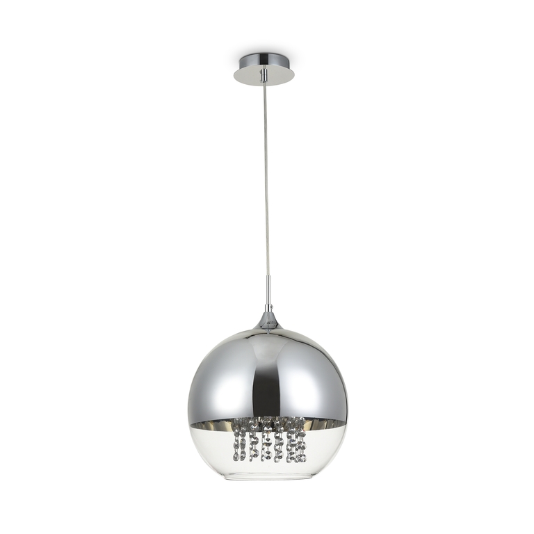 Арматура из металла в двух оттенках: никель и золото. Часть плафона выполнена из металла в тон арматуре, другая часть — из прозрачного стекла. Декоративные подвески внутри плафонов. Регулируемая высота.