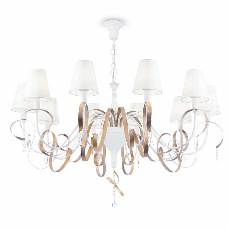 Арматура – металл, цвет – белый. Абажуры из белого хлопка, нанесенного на ПВХ. Декоративные металлические ленты золотого оттенка. Подвески из кристаллов. Регулируемая высота.