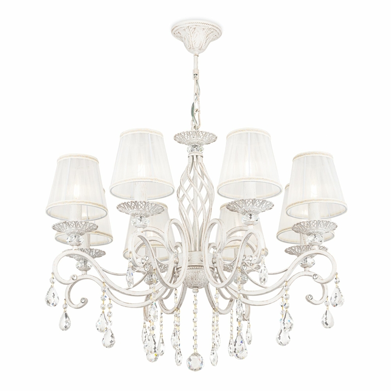 Металлическая арматура, оттенки – латунь, белый с золотом. Модели с открытыми источниками света и с абажурами. Абажуры из органзы, оттенки – бежевый, белый. Закрученный по спирали декор центральной оси. Подвески из кристаллов. - Высота люстр регулируется. Источник света - лампа с цоколем Е14.