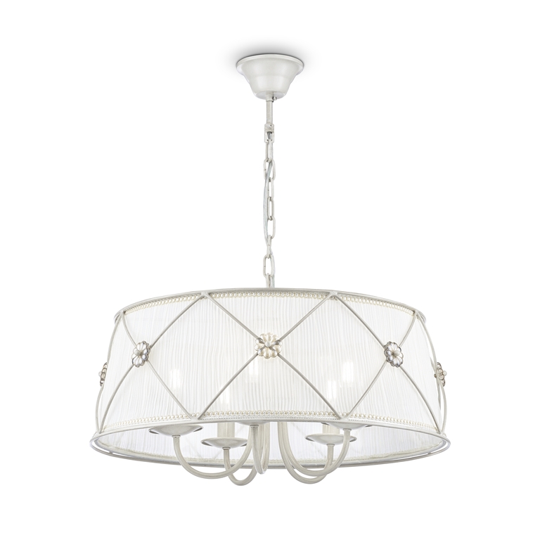 Арматура из металла в жемчужно-белом цвете. Кремовый абажур из плиссиро ванной органзы, окантовка золотистой тесьмой. Абажур заключен в металличе ский каркас. Флористический декор.