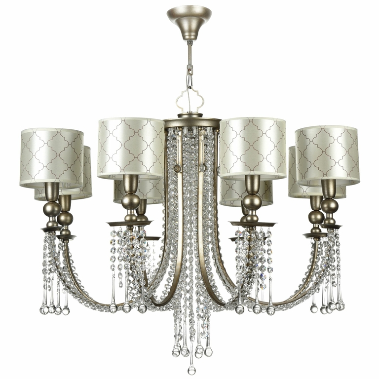 Светильники серии передают особое настроение. Богато украшенные, они наполнят освещаемый интерьер атмосферой блеска и роскоши. Арматура сделана из металла и окрашена в серебристый цвет с эффектом искусственного старения. Абажуры из ткани с орнаментом на ПВХ выполнены в стиле ар-деко. Финальный образ светильников формируют подвески из кристаллов.