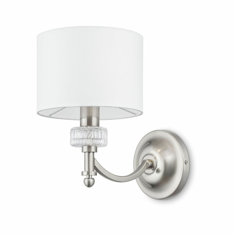 Материал основания – металл, цвет – никель. Абажуры из белой ткани на ПВХ. Декор центральной части и рожков – прозрачное литое стекло с рельефной фактурой. Высота люстр регулируется длиной цепи.