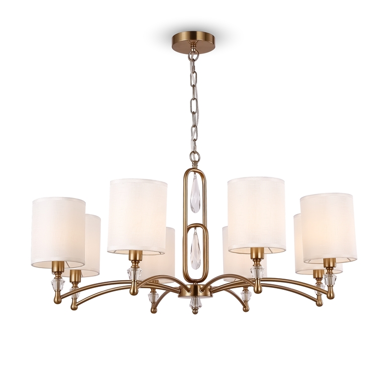 Материал арматуры – нержавеющая сталь, цвет – хром. Материал абажуров – текстиль на ПВХ, цвет – белый. Декор – прозрачное стекло. Акцентные стеклянные кристаллы на рожках со сложной огранкой.