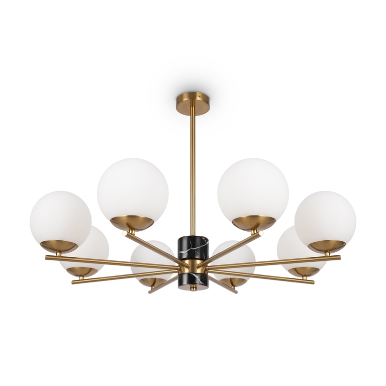 Арматура - металл, цвет - латунь. Мраморные черные элементы в основании. Плафоны-сферы из белого матового стекла с металлической апликацией у основания крепления в цвет арматуры. Сменямый источник света - лампы с цоколем Е27.