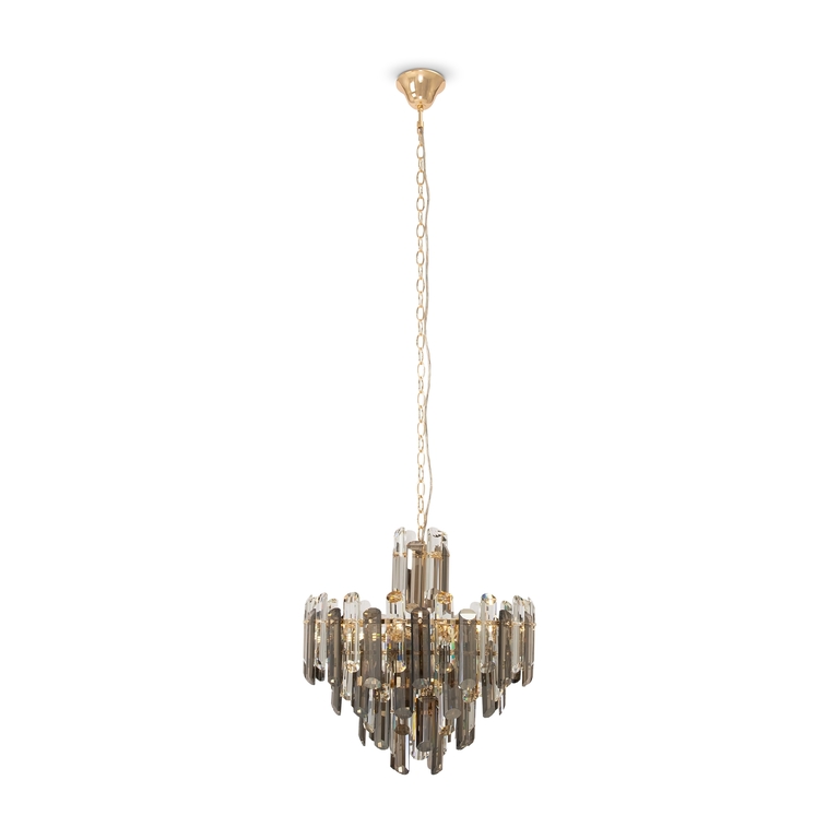 Материал арматуры – металл, цвет – золото. Декор – хрусталь крупной архитектурной огранки. Высота подвесных люстр регулируется цепью. Источник света – лампы с цоколем Е14.