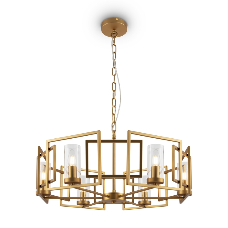 Арматура – металл, цвет – золото. Плафоны из прозрачного стекла. Каркас из наложенных друг на друга металлических рамок. Крепление 2 в 1 – монтаж с цепью и без нее.
