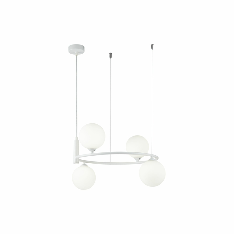 Арматура из металла в трех оттенках: белый, черный, латунь. Плафоны-сферы закреплены на округлом металлическом каркасе. Материал плафонов — выдувное стекло, цвет — белый. Высота подвесных моделей регулируется.