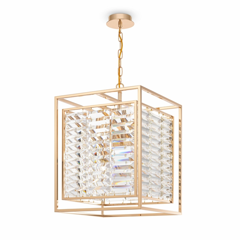 Арматура – металл, оттенки – хром, золото. Двойной геометрический плафон. Металлический каркас плафона окрашен в тон арматуре. Декор – стеклянные кри сталлы с трапециевидной огранкой. Высота подвесных моделей регулируется.