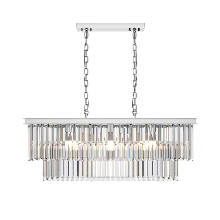 Арматура из металла в трех оттенках: латунь, хром, золото. Многоярусный декор. Подвески: прозрачное (арматура – хром, латунь) и янтарное (арматура – золото) стекло. Высота подвесных моделей регулируется.