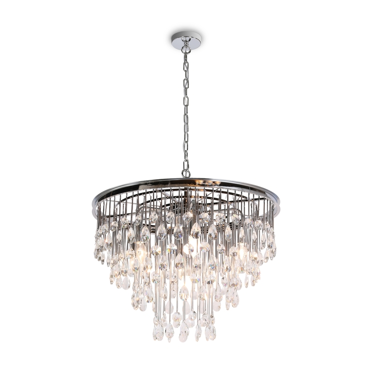Материал арматуры – металл, оттенки – золото и хром. Комбинация металла и хрусталя в декоре. Металлические трубки гальванизированы в тон арматуре. Хрустальные подвески обрамляют композицию. Высота люстр регулируется с помощью цепи. Цоколь Е14.