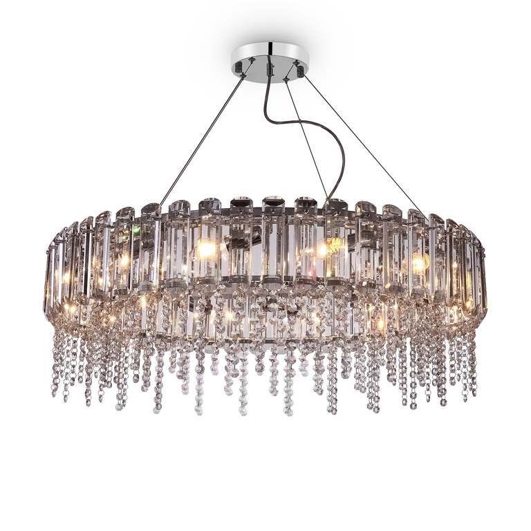 Арматура из металла, цвет – хром. Хрустальный декор двух видов: крупный вытянутый по внешнему периметру и округлый на подвесках. Высота подвесных моделей регулируется. Цоколь Е14.