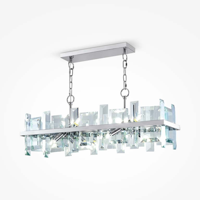Арматура из металла, цвет – хром. Плафон составляют пластины из прозрачного оптического стекла. Металлический каркас плафона окрашен в тон арматуре. Высота подвесных моделелей регулируется.