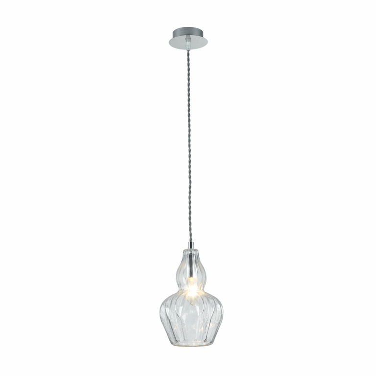 Арматура — металл, оттенок — никель. Рельефный плафон выполнен из стекла. Оттенки плафона — прозрачный и голубой. Витой провод. Регулируемая высота.